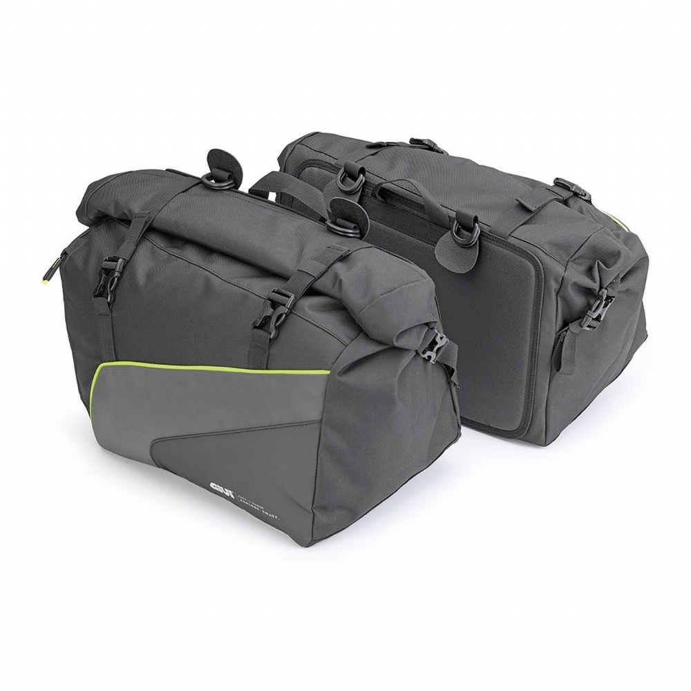 Materiali: • Poliestere 600D/PU W/R • Inserti in Pu e piping riflettente giallo fluo • PVC antiscivolo sul retro • Tessuto antifiamma alla base delle borse • Materiale riflettente nero opaco
