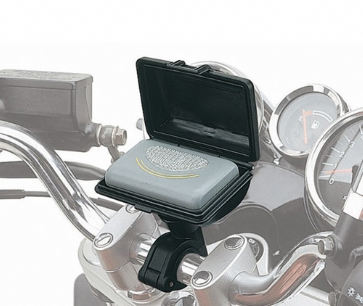 Custodia per dispositivi di pagamento del pedaggio autostradale del tipo "TELEPASS*" con kit universale per il fissaggio su manubri tubolari. *TELEPASS è un marchio registrato appartenente a Atlantia e Autostrade per l'Italia.