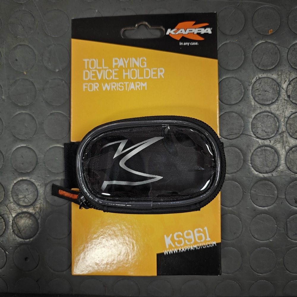 Porta dispositivo elettronico per pedaggio autostrada, fit regolabile grazie alla fascia con chiusura a strappo può essere indossato al polso o al braccio. Bordatura con inserti riflettenti a base scura che migliora la sicurezza attiva del pilota. Misure: 90 x 55 x 30 mm (l x h x p)